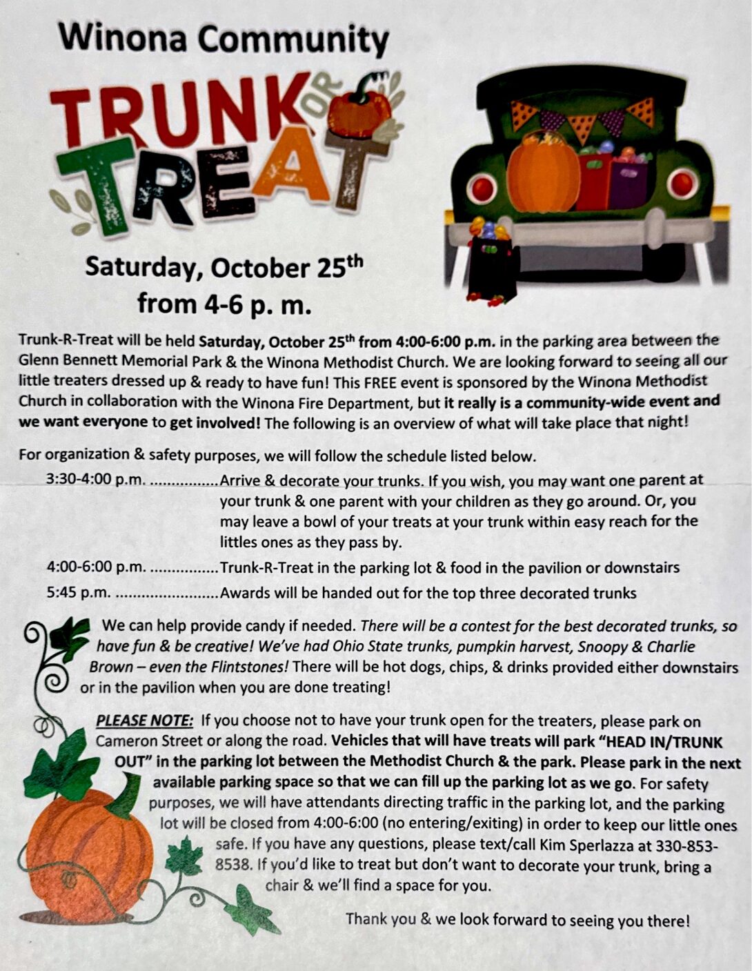 Trunk-R-Treat will be held Saturday, October 25th From 4:00-6:00 p.m. in the parking area between the Glenn Bennett Memorial Park & the Winona Methodist Church. We are looking forward to seeing all our little treaters dressed up & ready to have fun! This FREE event is sponsored by the Winona Methodist Church in collaboration with the Winona Fire Department, but it really is a community wide event and we want everyone to get involved! The following is an overview of what will take place that night!